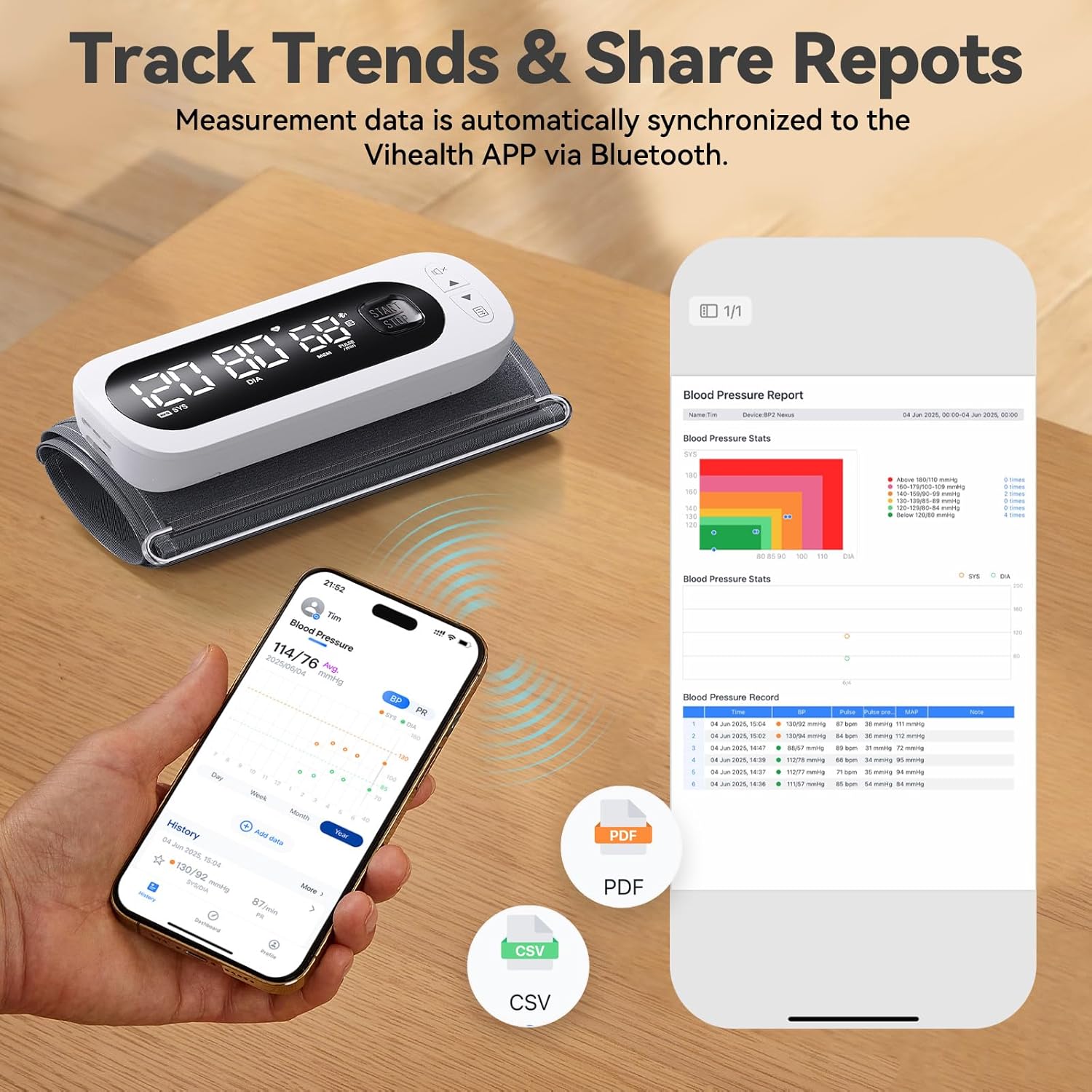 • Bluetooth Connectivity - Multi-user record management on ViHealth App (iOS/Android) with unlimited cloud storage & detailed blood pressure trend reports(PDF&CSV)