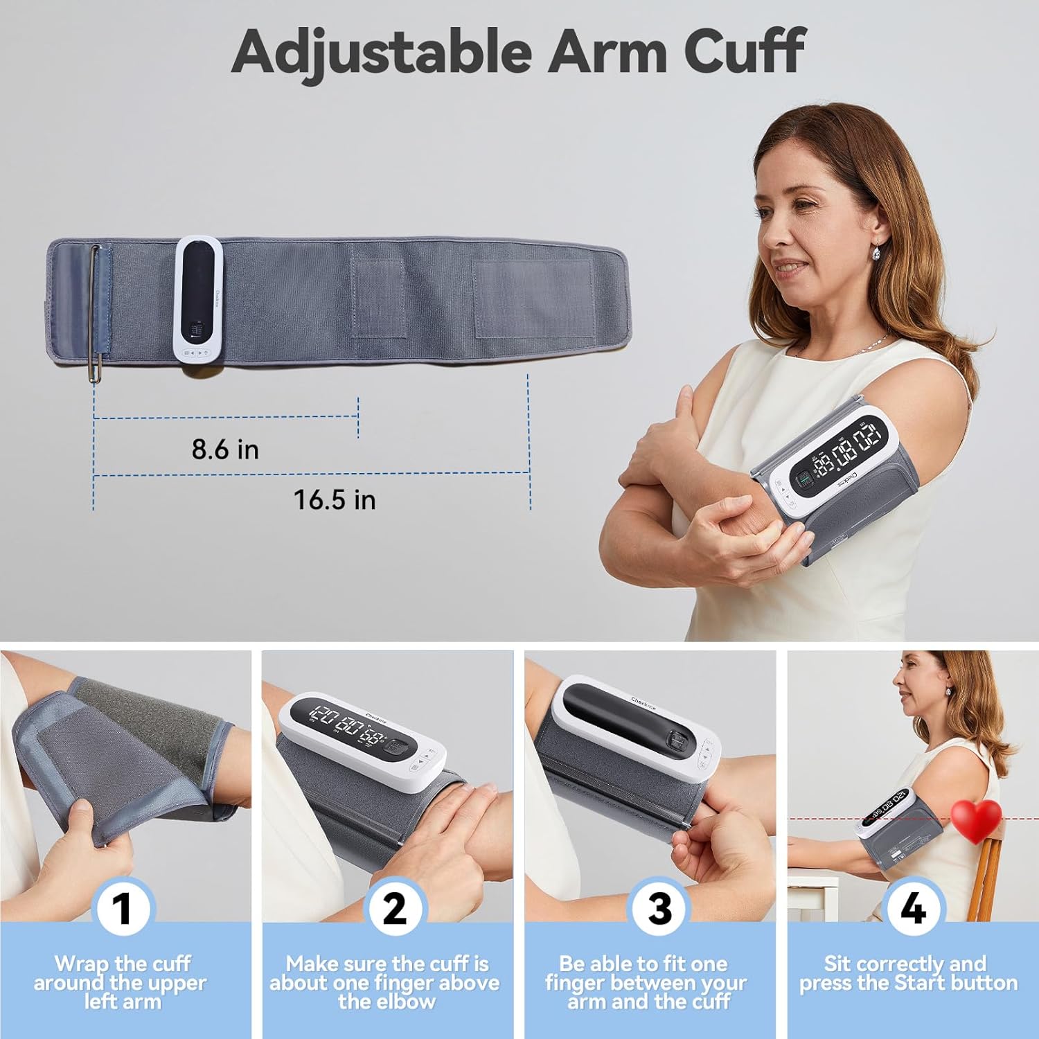 • Adjustable Wide-Range Cuff (8.6–16.5 in) – The extra-large blood pressure cuff ensures a comfortable and secure fit for most arm sizes, providing reliable measurements